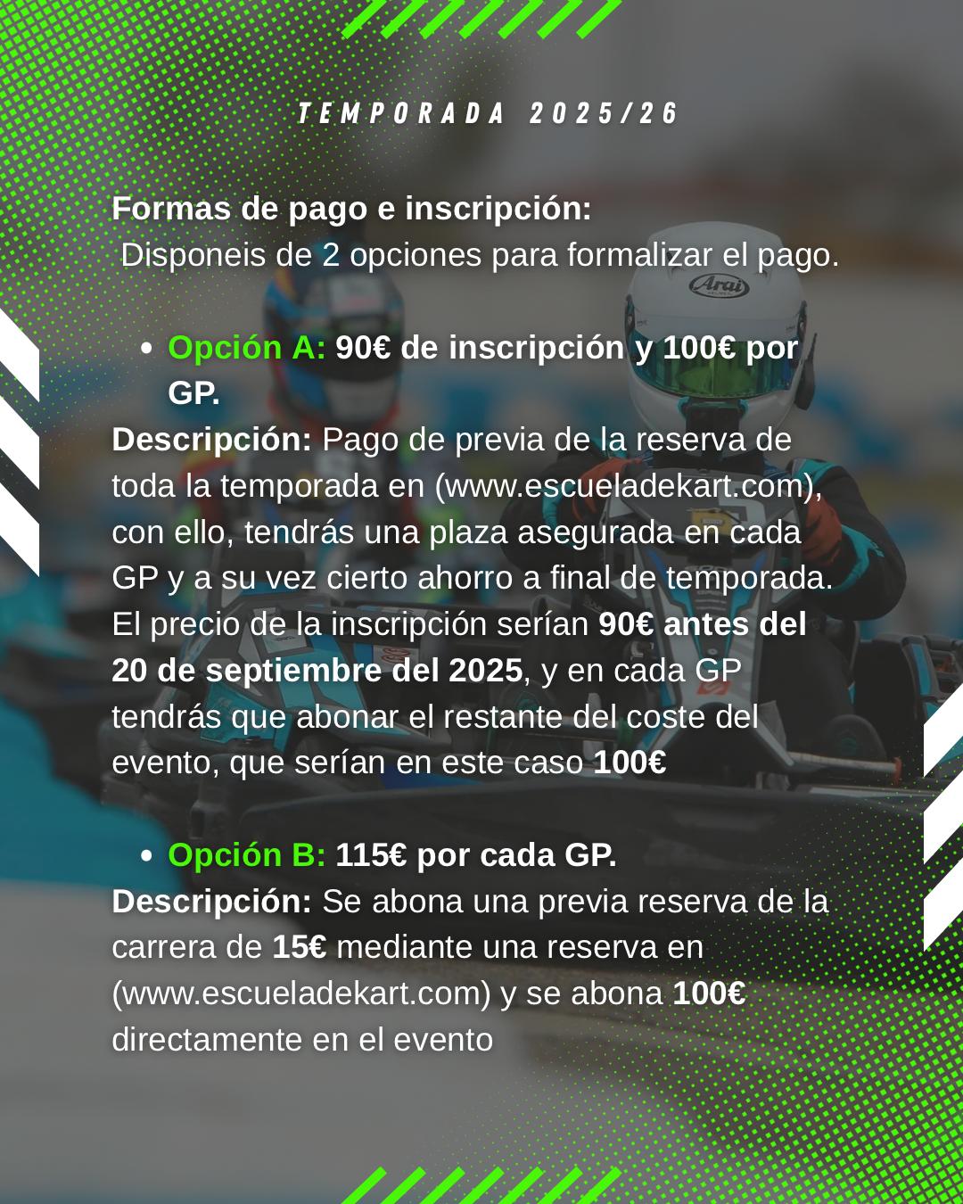 Opción A: 90 € de inscripción y 100 € por GP.